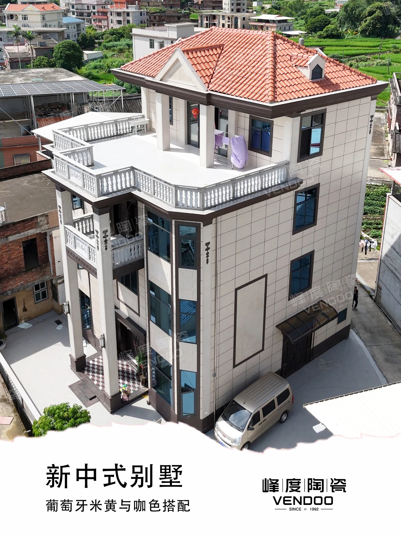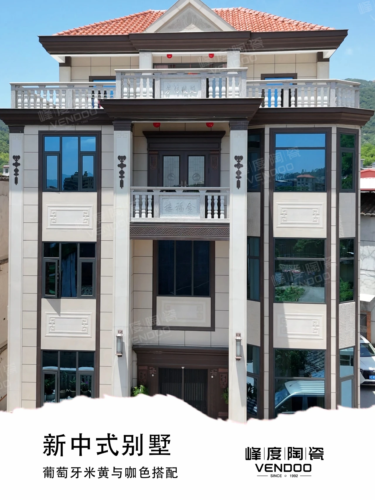 位于福建泉州诗山镇的独栋自建别墅,主砖选用了400x800mm葡米色中板,加上咖色配件点缀,丰富了外立面的层次感,整体搭配简洁明亮,没有太过华丽的颜色冲击。